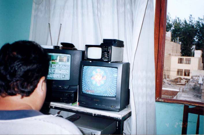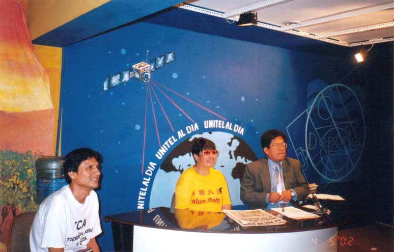 我们在阿亚库乔(Ayacucho)市受到本市的两个(Radio wari)电台(Radio Diffusion Atlantis)节目主持人现场直播采访。听了广播的有缘人,已在广场静静地等待着我们。五套功法教完了,人们久久不愿离去。晚上7点我们接受电视台RTP频道的采访后,前往阿班凯(Abancay)市。在阿班凯我们接受了电视友谊电台(Radio Tv Amistad)和激光电台(Radio Laser)节目主持人的采访。晚上我们应邀接受阿班凯市电视台11频道的采访。摄影棚里的节目主持人身穿写有“法轮大法Falun Dafa”和中西文“真善忍”字样的黄色T恤。向观众介绍法轮功,师父教功录影带的画面进入了千万户人家。在库斯科(Cuzco),我们无暇去游览此地的名胜古迹。威尔卡马约电台(Radio Wilcamayu)节目主持人采访我们后,偕同家人和朋友的家人一同来到(Fortaleza de Sacsahuaman)草坪学炼法轮功。身在海拔约3500米高原的普诺(Puno)市,我们如同在平地。我们接受了蓝色电波电台(Radio Onda Azul)和普诺市电视13频道节目主持人的采访后,来到中心广场炼功,向高原的人们展示法轮功的五套功法。