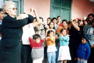 星期天十点小城广场进行升旗仪式。结束后,十点半,我们在广场炼功,观看升旗的人群还没有散开,有的就加入学炼法轮功的行列中。一位小姐的家住在利马炼功点的附近,却在这个小城遇到了我们,她非常认真地学完了五套功法,表示回家后一定要到炼功点炼功。这时我们看到电台的两个小伙子,他们亲自送来采访我们的录音带,看到广场学功教功的祥和景象,迟迟不愿离去,向大法弟子咨询不少有关炼功的问题,才依依不舍地离开。
