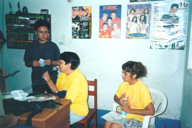 我们到了市政厅,见到市长,向市长介绍了法轮大法并递上大法真相资料。就电台的分布询问了市长,市长告诉我们附近三个电台的台长的名字和地址。其中也包括我们认识的。离开市政厅后,我们直奔其它叫电波交友(Radio Noda Amiga)电台和超感觉(Radio Super Sensaci)的两个电台,取得采访时间的预约。费雷利亚费电台(Radio Ferrefe)现场直播时,我们一一回答主持人的问题后,把大法的一套音像书籍留给了主持人并告诉听众。主持人兴奋地告诉我们:星期六他将去一间学校,为集中在那里的费雷利亚费的孩子、家庭约三千人播放师父西班牙文教功录影带。我们听了很感动。接着,我们又到了电波交友(Radio Noda Amigo)电台和超感觉(Radio Super Sensaci)电台,全是现场直播,我们在采访中把大法的网址反复告诉了听众。好让人们更多地了解法轮大法。下午,我们前往计划中的第五站厄瓜多尔边境省皮乌拉(Piura) 的省会--皮乌拉(Piura)市。