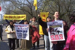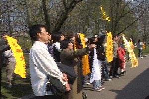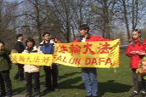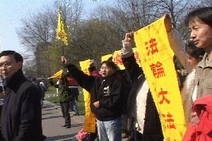 【明慧网2002年4月19日】由于江泽民的访德,更引起市民们对法轮功的关注和兴趣。在柏林著名的菩提大道街心,离江住的五星级ADLON宾馆150米远处,几百名大法学员72小时,昼夜不停地炼功发正念,一面面大横幅尤为醒目,这场景引来无数行人,游人的关注,他们纷纷走进炼功场地,拿资料,了解真相,有的索性请学员教功,有的成群留下学完所有的功法才离开。这儿每天都成了学员们举行的大型洪法咨询日。