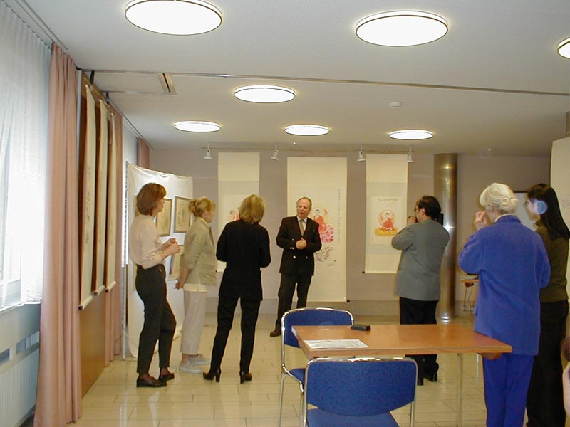 3月19日,画家章翠英女士的画展在世界名城─日内瓦市中心隆重举行。瑞士法轮功佛学会成员到会支持章女士,赞扬章女士为了弘扬法轮大法,为了使人们能更进一步了解中国江泽民迫害法轮功学员的真实情况,在日内瓦人权会议期间来到了日内瓦。在把中国的传统文化艺术之美带给本市市民的同时,向各国政府、媒体紧急呼吁营救中国受迫害的法轮功学员,要求江泽民立即停止这场恐怖的镇压。世界需要“真善忍”。