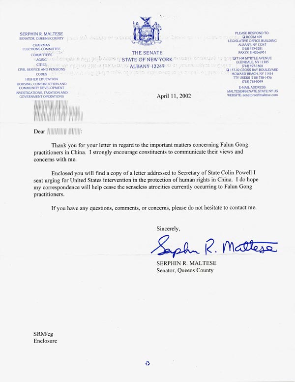 • 纽约州参议员给学员的信及写给国务卿支持法轮功的信