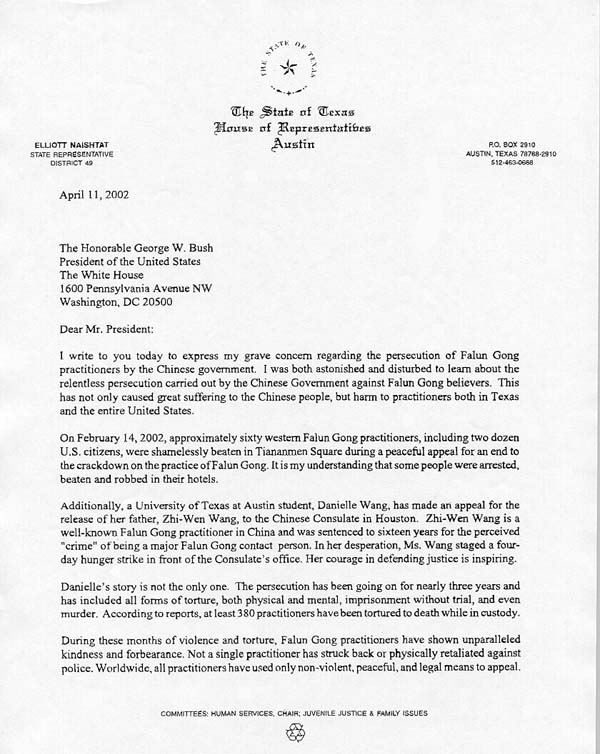我今天给您写信对中国政府迫害法轮功学员之事表示深切的关注。当我得知中国政府对法轮功学员施以残酷的迫害时,我感到既震惊又不安。这场迫害不仅给中国人民带来了巨大的痛苦,也使德州以及全美国的(法轮功)学员受到了伤害。