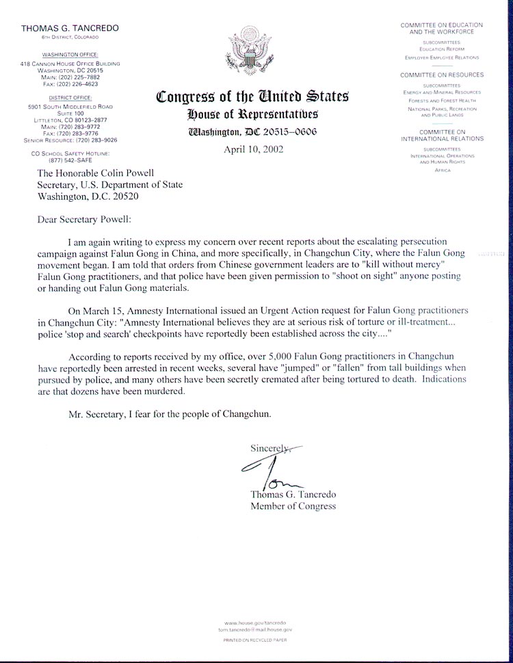 【明慧网2002年4月25日】美国国会议员汤姆斯.坦科雷都致信国务卿鲍威尔,对最近中国加剧镇压法轮功的报道深表关注,并为长春市人民的生命安全表示担忧。译文如下: