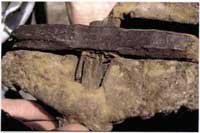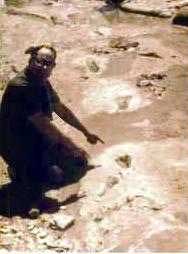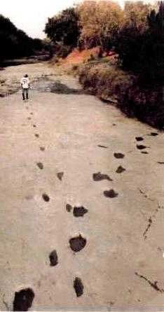 在美国得克萨斯州Glen Rose的瑞拉克西河(Raluxy)河床中发现有生活在白垩纪的恐龙的脚印。考古学家们吃惊地在恐龙脚印化石旁十八英寸半的地方,同时发现有12具人的脚印化石,甚至有一个人的脚印叠盖在一个三指恐龙脚印上。把化石从中间切开,发现脚印下的截面有压缩的痕迹,这是仿制品无法做到的,显然不是假冒的。另外在附近同一岩层还发现人的手指化石和一件人造铁锤,有一截手柄还紧紧留在铁锤的头上。这个铁锤的头部含有96.6%铁,0.74%硫和2.6%氯。这是一种非常奇异的合金。现在都不可能造出这种氯和铁化合的金属来。一截残留的手柄已经变成煤。要想在短时间内变成煤,整个地层要有相当的压力,还要产生一定的热量才行。如果锤子是掉在石缝中的,由于压力和温度不够,就不存在使手柄煤化的过程。这说明岩层在变硬、固化的时候,锤子就在那儿了。发现人造工具的岩层和恐龙足迹所在岩层是一致的,而其它岩层都没有恐龙足印和人造工具。这说明人类和恐龙的确曾生活在同一时代。