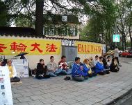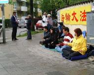 快到晚上了,有几个领馆的工作人员出来,学员们马上递上真相材料,他们说,领馆已有很多,您们在这一天也真辛苦了。可是他们不知道,我们这么做都是自愿的,有很多学员开四五个小时的车,还有的学员是从奥地利赶来的。我们这么做的目的是希望他们也能了解迫害真相。