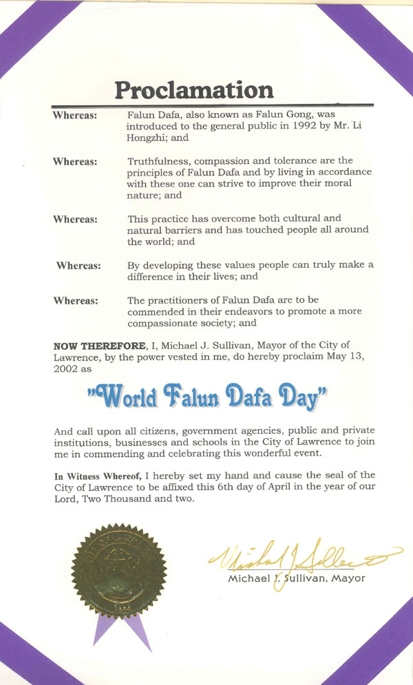 因此,我,迈克尔 J. 苏利文,劳伦斯市市长,以我所被赋予的权力,特此宣布,2002年5月13日为