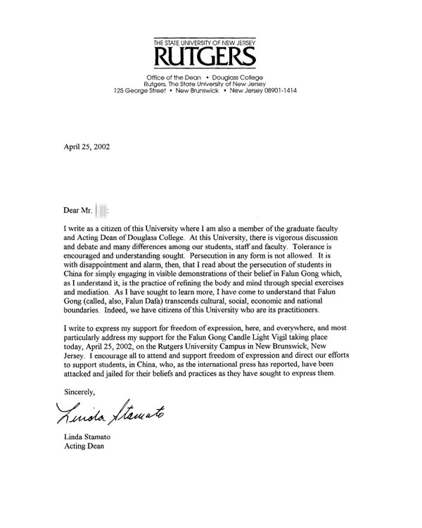 我以新泽西州立大学研究生分院的成员以及道格拉斯分院院长的名义给你回信。([就法轮功问题],本校学生及教职员工展开了一场别开生面的辩论。尽管大家有不同见解,但是都认为宽容和理解是应该的,不能允许任何形式的[对真善忍的]迫害。)在本校,学生和教职员来自不同的背景,常有激烈的讨论和辩论。我们鼓励大家容忍和寻找互相理解。任何形式的迫害是不允许的。当我得知那些中国学生,仅仅因为修炼法轮功就遭到迫害, 我感到很失望和震惊。我知道修炼法轮功可以通过特殊的运动和打坐使人身心得到升华。后来当我[对法轮功]有了更进一步的了解,我懂得了法轮功(又叫法轮大法)实际上超越于一切文化,社会,经济,国家与民族的范畴。事实上,在我们学校,就有法轮功修炼者。