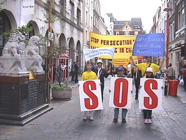 中午12时,在普度和济世的音乐伴奏下,由中使馆至首相府的游行队伍缓缓起步。三名大法弟子手持SOS标语板在前,随后的学员手举各种大法横幅依次在后。 庄严肃穆的游行队伍在繁忙的伦敦街头引人注目,路上行人纷纷驻足观看并不时索取大法资料。很多早已了解法轮功真相的人们不时用手势和言语向游行队伍表示敬佩和支持。路过唐人街时,很多餐馆和店铺的华人纷纷走出来观看。很多人愿意接受大法的真相材料。一位华人在向一位大法弟子了解了一些真相问题后,郑重地表示一定阅读真相手册。一些华人还打听炼功地点。在唐人街停留的短暂时间里,很多华人都手持真相手册。人们已逐渐认清江泽民集团一贯的欺世谎言,特别是对法轮功的造谣诬陷已不再具有效力了。