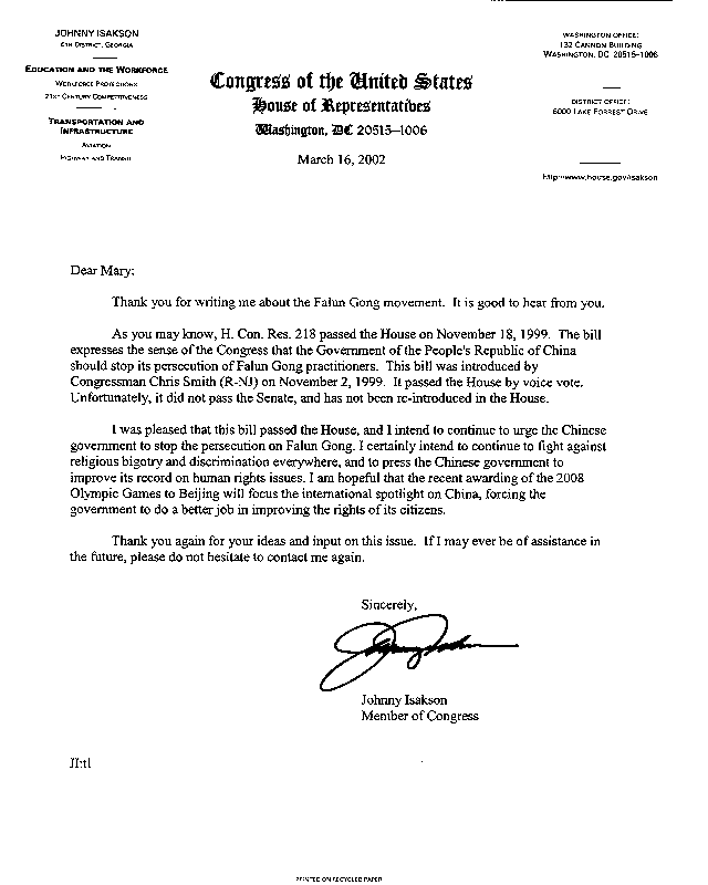 正如你所知,众议院于1999年11月18日通过了第218号决议。这项决议表达了国会要求中国政府应立即停止迫害法轮功学员的意旨。这项决议是由新泽西州的共和党众议员克瑞斯.史密斯议员于1999年11月2日提出的。众议院进行语音表决通过了这项决议。遗憾的是,它没能通过参议院,也未再次在众议院提出。