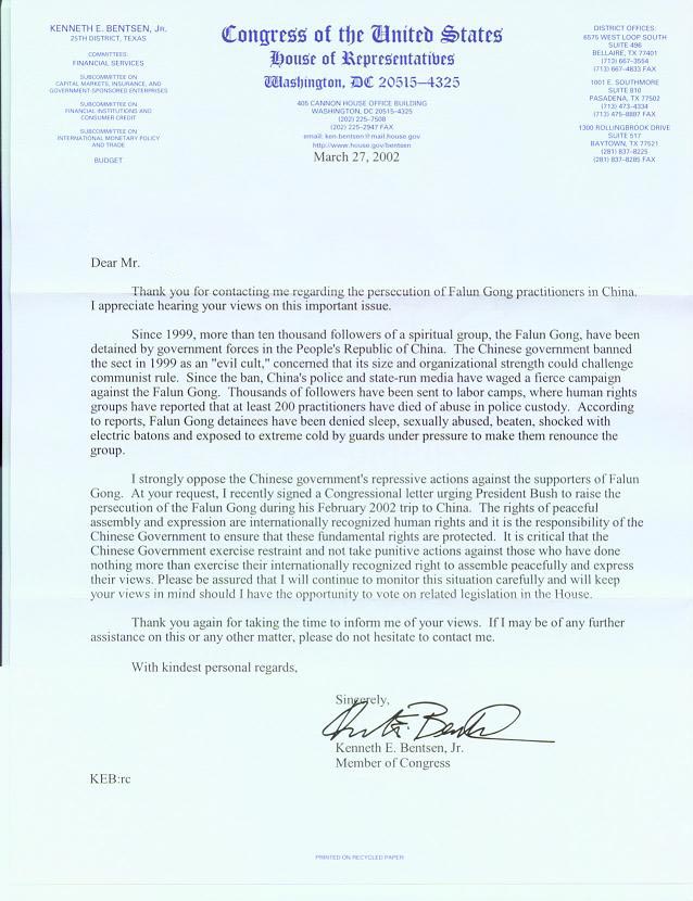 我强烈反对中国[江泽民]政府对法轮功支持者们的镇压。应您的要求,我最近在一封国会信件上签名,敦促布什总统在2002年2月访华期间提出法轮功遭受迫害的问题。和平集会与言论的权利是国际公认的人权,中国政府有责任保障这些基本人权受到保护。中国[江泽民]政府应当自律,不能对那些只是行使国际公认的和平集会与言论权利的人们施加刑罚,这是至关重要。请您放心,我将继续关切这个情况的发展,若有机会在国会众议院就相关的议案进行投票的话,我将记住您的意见。