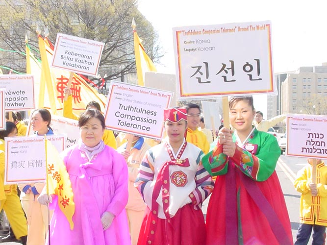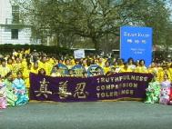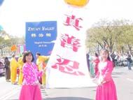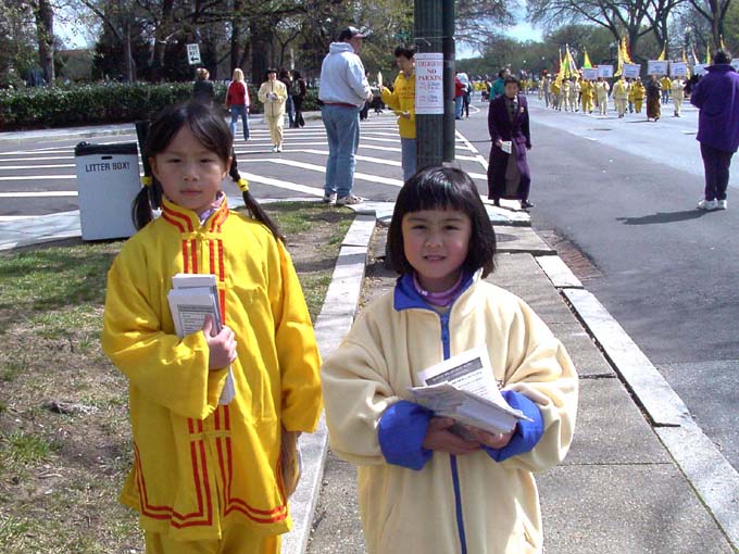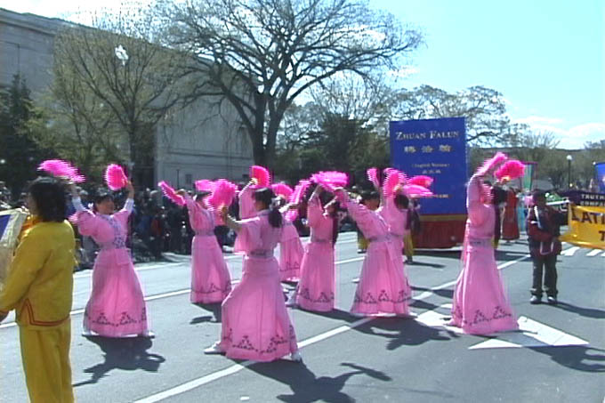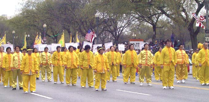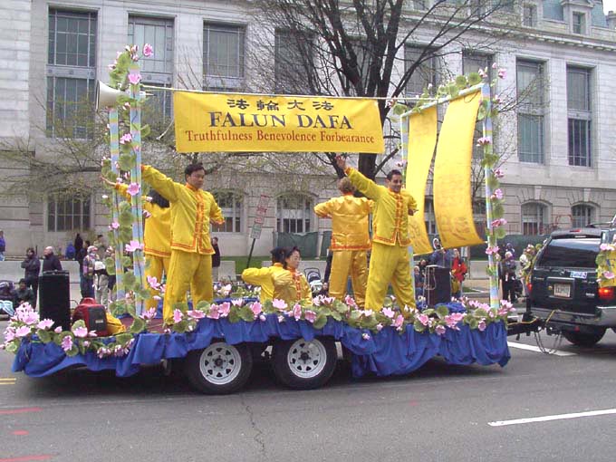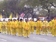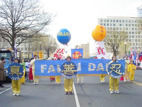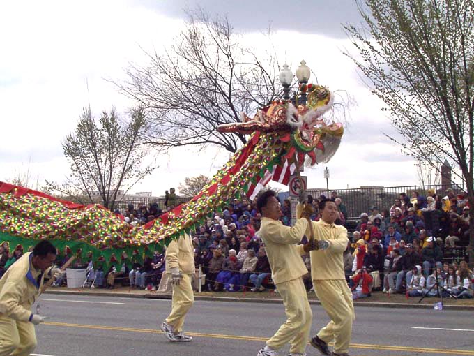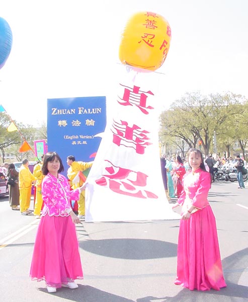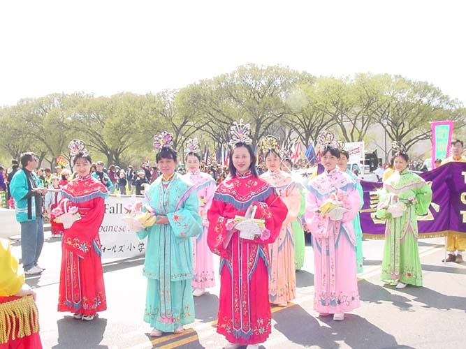 【明慧网2002年4月9日】2002年4月6日,是美国首都华盛顿一年一度的樱花节大游行的日子,法轮功学员再次参加节日游行,向美国人民展示法轮功的风采。来自加州、纽约、费城、新泽西、特拉华、北卡、华盛顿DC、弗吉尼亚及马里兰州等近300名法轮功学员参加了本次游行。