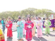 从上午8点左右开始,六、七十支游行队伍、数千人在美国国会山庄前的大草坪上集会,整列队伍。法轮功学员也纷纷搭好了花车、竖起了横幅,格外醒目。游行中,学员们随着优美的炼功音乐,边走边演示着动作舒展协调的功法,赢得了一路上数万观众的掌声。与往年不同的是,这次的游行增添了不少文化特色:来自加州的由学员自发组成的舞蹈队身着粉色衣裙,随着普度音乐翩翩起舞,格外引人注目,所到之处掌声不断。数十块用各国文字写着“真善忍”的小展板向世人展示了大法在世界几十个国家的洪传。一些女学员身着色彩缤纷的中国传统服装,韩裔、印度裔学员身着本国民族服装,吸引了众多观众争相要求合影并主动询问有关法轮功的情况、索要资料。队伍中更有舞龙表演,为人们带来喜庆和欢悦。学员们祥和的问候与慈悲的笑容,浸沁着人们的心灵,给人们带来了“佛光普照,礼义圆明”的震撼。观众们纷纷伸出大拇指:“你们真美好!”队伍行经主席台,主持人热情、全面地介绍了法轮功,观众们再次报以热烈的掌声。