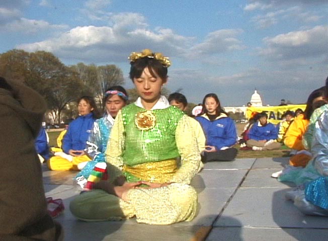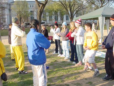 游行结束后,学员们在国会山庄大草坪上搭起帐篷和舞台,进行功法演示,并举行文化表演,大提琴独奏、民族舞蹈、舞龙等表演使樱花节更显得热闹非凡,吸引了众多游人驻足观望,并索要大法资料,有些游人当场学起了五套功法。早上才飞抵华盛顿的加州舞蹈队不顾旅途劳累,不仅立即参加了节日游行,还在下午的文化演出中为观众献上多台精心准备的舞蹈,其中一些更是以大法弟子在严酷迫害中的坚韧不屈、大善大忍为主题。在一旁解说的学员伴着舞蹈的情节变化,向观众们解释着大法的美好与江泽民迫害的邪恶本质。艺术的深刻表现力,淋漓尽致地把真相展现给人们。寒风未尽,但初春的阳光、大法的祥和慈悲却温暖着人们的心灵。