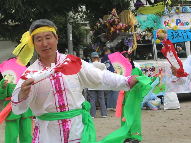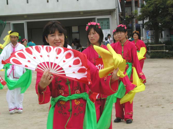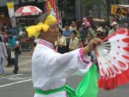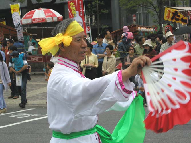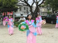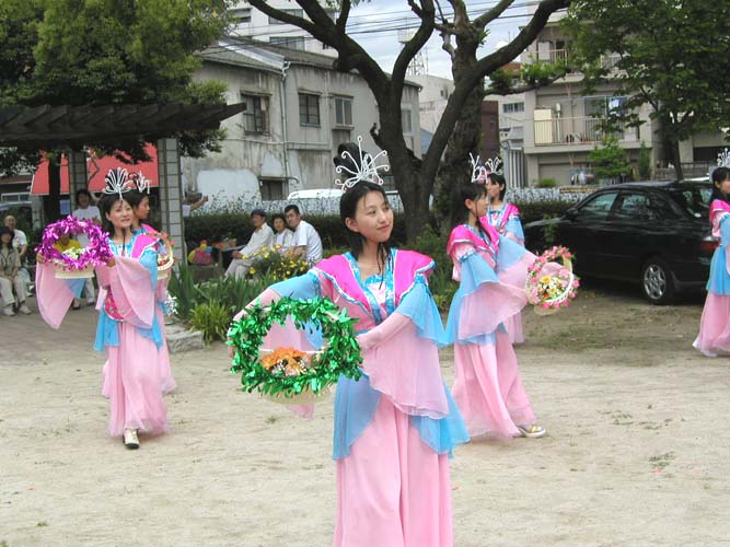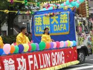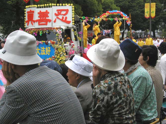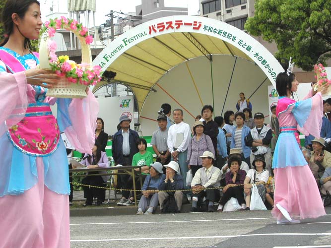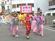 花车,飞天,秧歌队伍和黄色炼功服。来自日本南北各地的2百余名法轮功学员组成了这支亮丽出众的队伍。3天的花祭期间,法轮功学员将在百万游客的瞩目下展示法轮功的祥和美好风貌。美丽的彩车,轻盈的飞天,庄严的队伍,祥和的功法展示,引来路旁观众屏神观看。