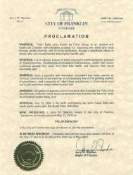 鉴于,法轮功修炼者在最残酷的环境中所表现出的大善大忍精神已经深深地触动了每一位善良人的心灵;并且鉴于,2002年5月13日是法轮大法公开传出10周年纪念日,同时也是世界法轮大法日。