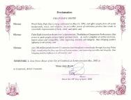 鉴于,法轮大法超越文化和种族的界线,为实现一个共同的梦想──建立一个和平、包容和更加慈善的社会做出了贡献;并且鉴于,法轮大法修炼者在最严酷的环境中挺身捍卫真、善、忍的决心和勇气使我们重新感受到了生命的价值和人类尊严的可贵;