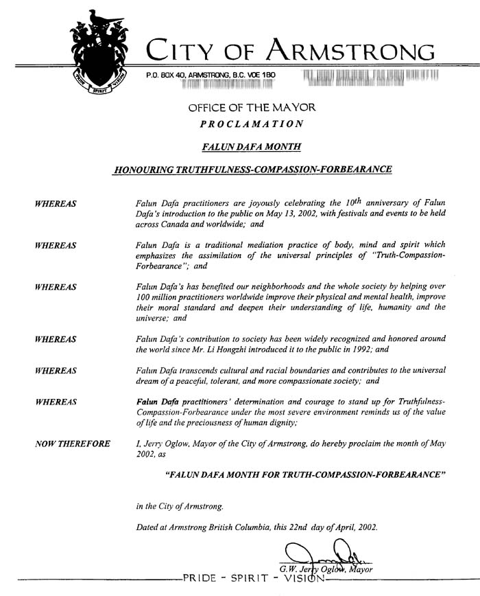 加拿大不列颠哥伦比亚省阿姆斯特朗市宣告“法轮大法月”