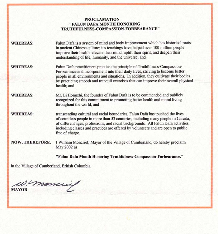 因此,我,康姆兰德镇(Cumberland)镇长长威廉·蒙克里夫(William Moncrief),在此宣布2002年5月为不列颠哥伦比亚省康姆兰德镇