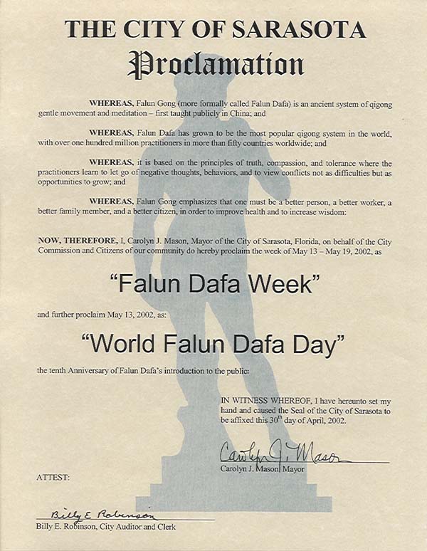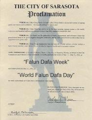 美国佛罗里达州萨拉托加市宣布“法轮大法周”和“世界法轮大法日”