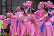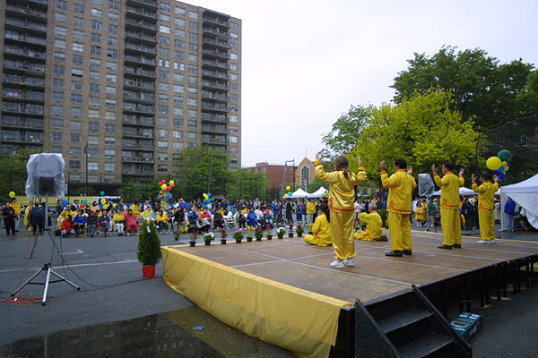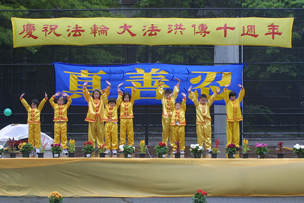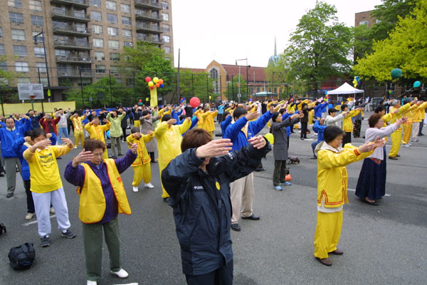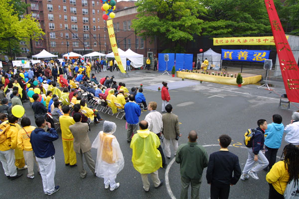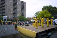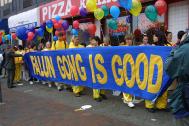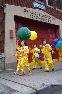 清晨,身着节日盛装和炼功服的法轮功学员从纽约市五大区和康州、新泽西州、费城汇集到纽约中国城——法拉盛,举行今天的庆祝活动。上午十点三十分,二百名法轮功学员冒着绵绵春雨,在法拉盛的主要街道缅街、罗斯福大道、联合大街进行庆祝游行,他们手执“法轮大法好”的彩色横幅,擎着五彩缤纷的气球,在《法轮大法好》的乐曲声中行进,有身穿黄色炼功服的,还有许多女学员身着“飞天”彩衣,宛若天女下凡,引得人们啧啧称奇。节日的气氛感染了人们,纷纷友好地向学员们索取资料。
