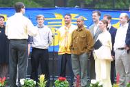 庆祝会上学员们还演出了自己编导的文艺节目,并作了法轮功的功法演示。这场文艺演出包括了舞狮、舞蹈、鼓乐、长笛大提琴三重奏、配乐诗朗诵、独唱、小合唱、大合唱及古装服饰表演等十九个节目,历时三个多小时。所有节目都是学员自编、自导、自演的,而且仅仅用了不到两、三个星期的时间排练、准备。每个节目都具相当的水准,因为学员们都是在用心、用自己的亲身体验来表演,真切地展现出“法轮大法好”,在观众的心中产生了强大的共鸣。