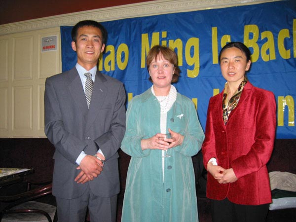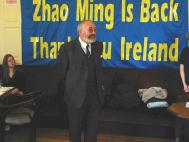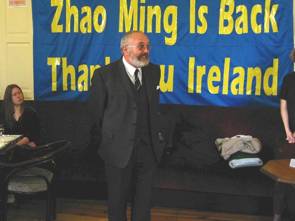 两位议员、国际特赦组织代表和三圣大学研究生会主席发表了热情洋溢、正义感人的讲话。爱尔兰政府众议院大卫.诺芮斯(David Norris)先生曾多次在议会就赵明的问题提案,提到法轮功是如此祥和,不应该受到这么残酷迫害。欧洲议员帕翠莎.莫肯女士(Patricia McKenna),“我们很高兴赵明获得自由了,但是我们不能忘了,在中国还有很多人(法轮功学员)在承受苦难,这场为了那些处于艰难处境下的人们的自由的运动还应该继续进行。赵明被抓前在爱尔兰读书,所以他在这里有许多支持帮助者;而中国还有千千万万处境艰难的人,外界无法知道并帮助他们。法轮功是一种祥和的修炼,他们只是通过修炼提高自己的道德水准,对社会没有任何危险、没有任何威胁,他们修炼的权利决不应该被剥夺,并因此遭受无名的苦难。我们必须为所有仍在中国遭受迫害的人们(法轮功学员)的自由和权利坚持不懈地努力。……”国际特赦组织爱尔兰分部运动主任富兰克.杰宁斯(Frank Jennings)提到,他认识赵明是在1999年赵明回国之前,那时中国已经开始镇压法轮功,赵明和另一位法轮功学员戴冬雪去跟他见面,寻求对法轮功的帮助。他几次应邀在为营救赵明的运动或新闻发布会上讲话,看到赵明终于安全归来很高兴,营救赵明是一个成功的运动。