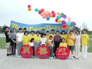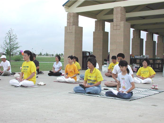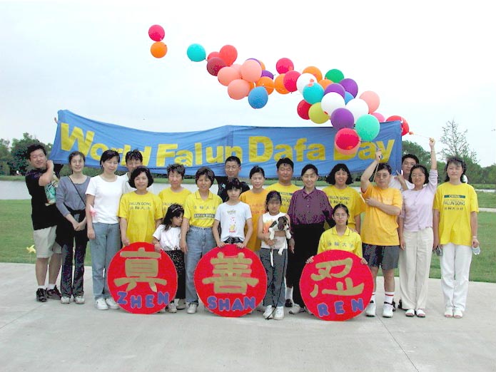 【明慧网2002年5月14日】5月12日,为庆祝第三届“世界法轮大法日”和法轮大法传出十周年,来自达拉斯附近地区的数十名法轮功学员们一早就赶到了位于普兰诺市(Plano)的拉瑟小溪公园(Russell Creek),布置起横幅,展板和美丽气球,然后在公园里进行了弘法炼功活动。同修为大法日特别连夜赶制的精美的展板和弘法小风车,犹受小朋友欢迎。由于是周日,附近有不少来这里休闲的居民,他们都被学员们精心布置的展板所吸引,不少人驻足观看。