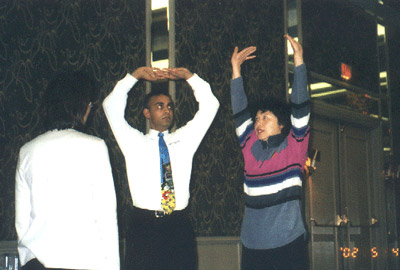 关心平时哪里可以就近参加集体炼功,几乎是每一个当场学了功的人都在问的问题。博览会下来,有二十几个有缘人留下他们的姓名和联络电话,希望能参加九天班。有个西人很感兴趣,并建议说:她有几个朋友都喜欢气功,等她组织好一些人,找到适当的场地就打电话请我们去作讲座,教功和办九天班。