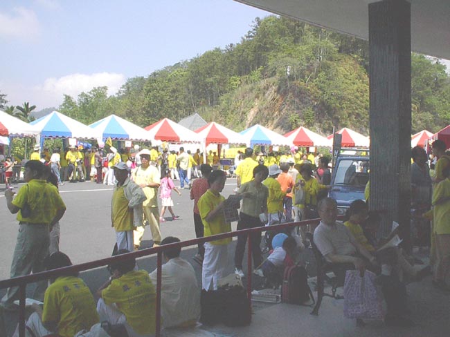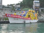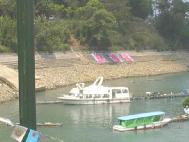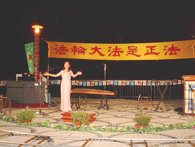 | 日月潭边斗大的真善忍 | 码头上小型排字 | 小弟子演奏并示范第五套功法 |