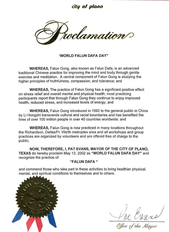 因此,我,德克萨斯州佩来诺市市长帕特. 埃文斯,特此宣布2002年5月13日为“世界法轮大法日”,盛赞“法轮大法”