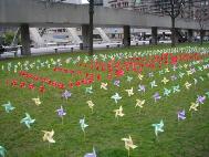 广场中央硕大的氢气球高高悬起,上面写着醒目的中英文大字“真善忍”。广场的入口处高六米,宽四米的庆祝“加拿大法轮大法节”的宣传画引人瞩目。拼成了“FALUN DAFA”的数百小风车在微风中飘动。