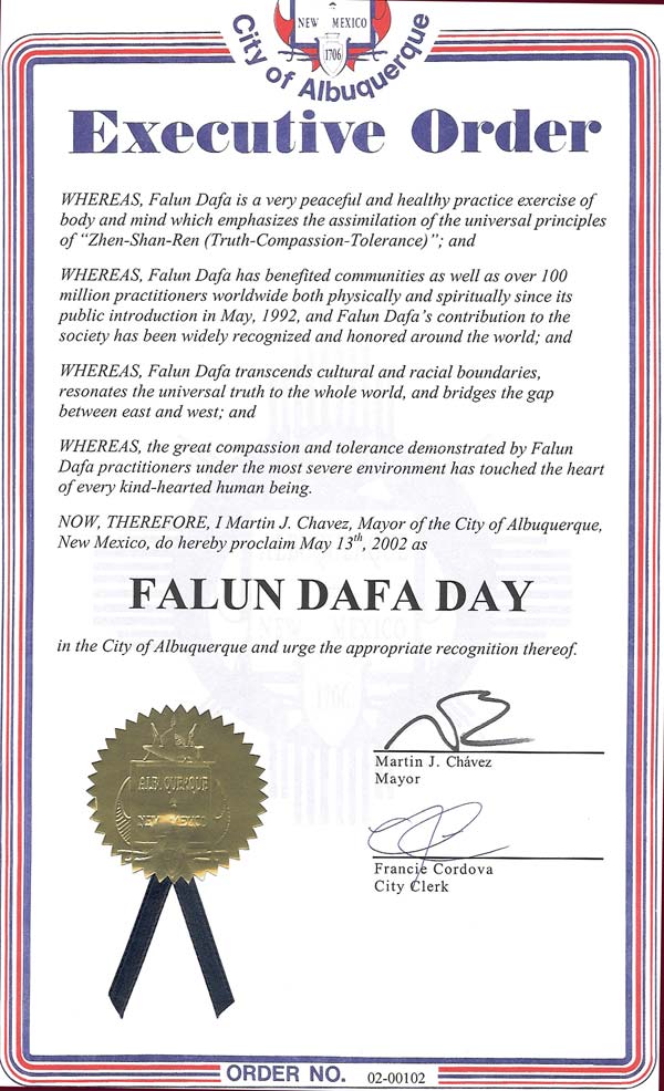 鉴此,我,马丁.伽弗兹(Martin J. Chavez),新墨西哥州阿尔伯库尔魁市的市长,特此宣布2002年5月13日为阿尔伯库尔魁市的