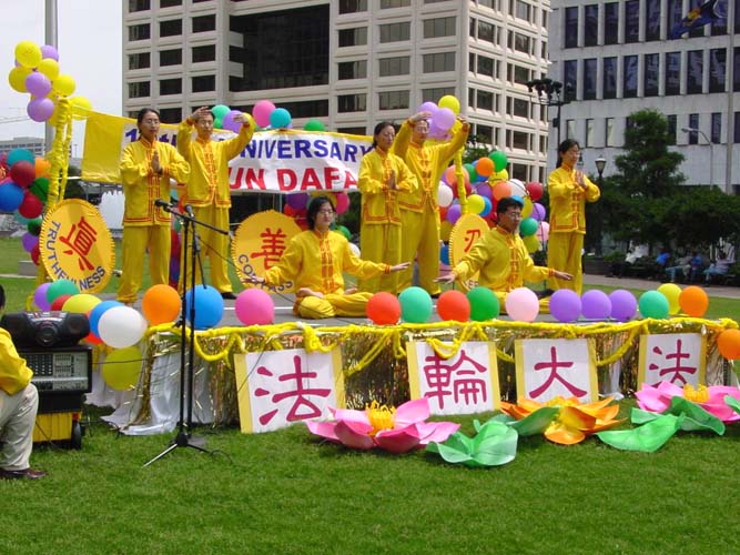 侨界领袖赵增义先生非常同情和支持法轮功。他乘公共汽车来到市中心与学员们一起庆祝世界法轮大法日。他真诚地说:“我看到了你们修炼人真是慈悲祥和,我很感动。你们的师父太伟大了!祝你们师父生日快乐,全世界人都会快乐!”寥寥几句话道出了善良人们的心声。此次庆祝活动历时三小时,大法弟子们用短短的三天时间就排出了象样的歌舞表演,大法弟子们用大法赋予的智慧和大法弟子们一颗颗对大法坚如磐石的心,又一次向世人展示了大法的美好殊胜。节目的最后,台上台下的大法弟子和观众一起唱起了《法轮大法好》,庆祝活动在弟子们齐声向师父问生日好中圆满结束。