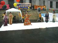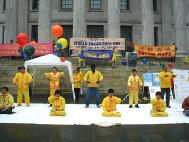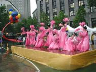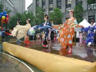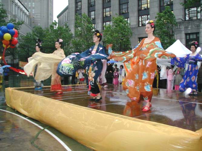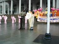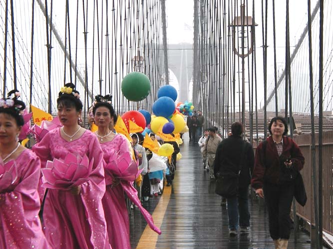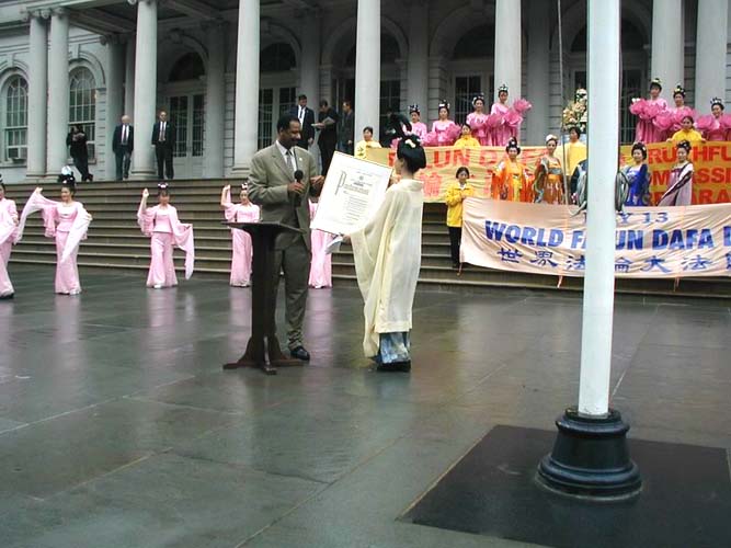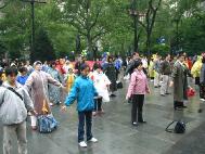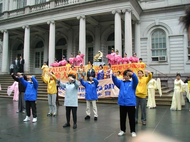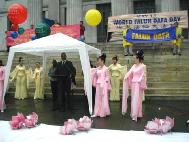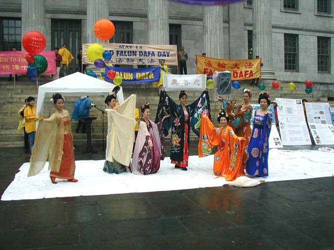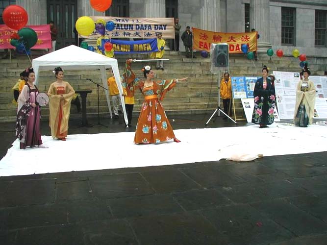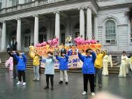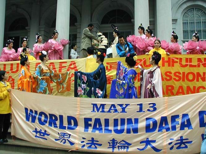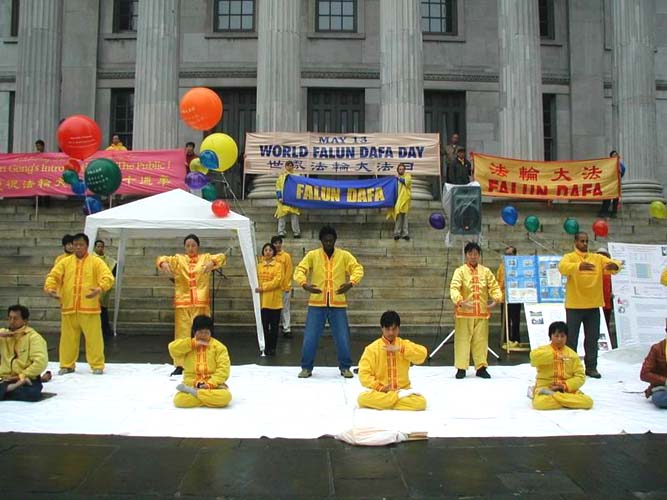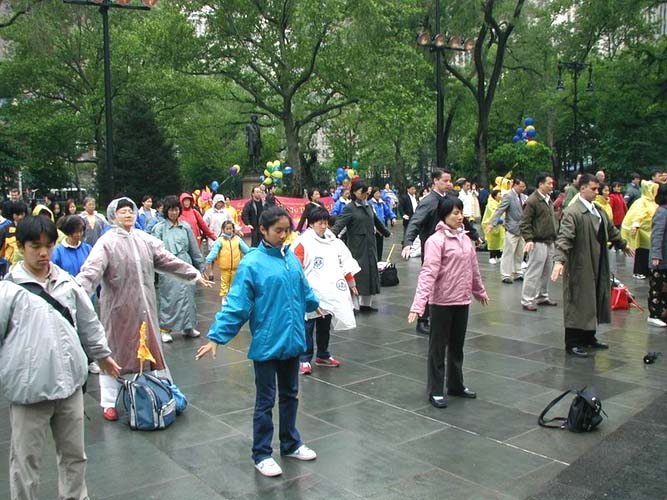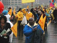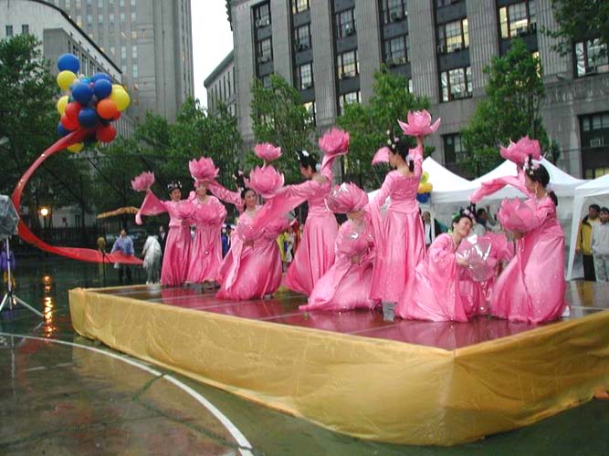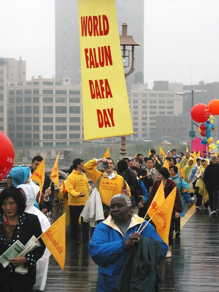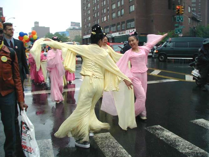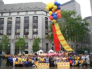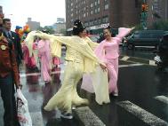 然后,学员们高举彩色横幅、五彩缤纷的气球擎起的“世界法轮大法日”竖幅,手执“Falun Dafa”和美国国旗的三角彩旗,敲锣打鼓,声势浩大地穿越下城闹市区向纽约中国城进发。一路上,许多华人都接过了学员递上的资料。有的摊贩还将“Falun Dafa”的三角彩旗插在门口的货架上表示对法轮大法的支持。在经过中国城街道时,学员用普通话和粤语向华人广播法轮大法的起源、发展和良好的社会效益,同时也揭示了三年来中国江泽民集团的无理镇压。伴随游行队伍,有一辆大型广告车展示“世界法轮大法日”的巨幅广告,上面学员在公园草地上打坐炼功,为游行增添了气氛,引起路人的赞叹。