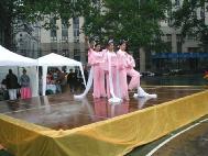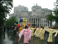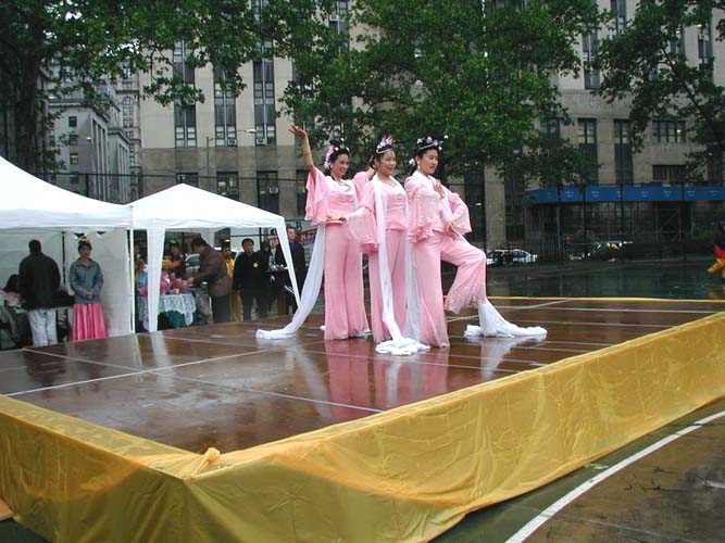 在中国城的庆祝活动遇到了邪恶的严重干扰。在游行队伍出发时,队伍中混进了几个动机不明的人,被学员劝了出去。当游行队伍经过中国城中心的一个街角时,有一伙不明来路的人高喊污蔑法轮大法的口号。这时,乌云密布,下起一阵瓢泼大雨。学员们不为所动,齐发正念,清除邪恶。雨渐渐变小了。后来,这一伙人又继续在学员举行文艺演出的哥伦布公园长时间鼓噪捣乱。在随后的半小时内,天空下起倾盆大雨。学员们先炼功,然后就像一尊尊顶天立地的神,长时间站立在暴雨中发正念,雨势渐渐转小。这时那伙来骚扰的人销声匿迹。一些学员继续发正念,一心坚定除恶,并不因这个空间中是否雨停而受影响。学员们在小雨中坚持演完了自己编导的文艺节目。一些维持秩序的警察为学员坚韧不拔的精神感动。