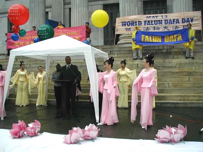 纽约市议员Allan W.Jennings和州众议员Adriano Espaillat的代表Elizabeth Rodriguz代表纽约市人民为师尊主持了切生日蛋糕仪式,全场掌声雷动。接着,代表来自世界各地的学员,包括美国、俄国、日本、澳大利亚、中国、多米尼加、瑞典、德国、巴西、马来西亚等,一一向师尊致生日快乐。