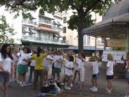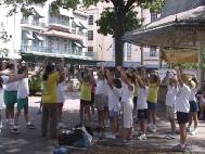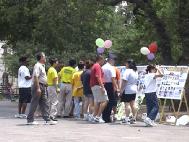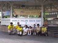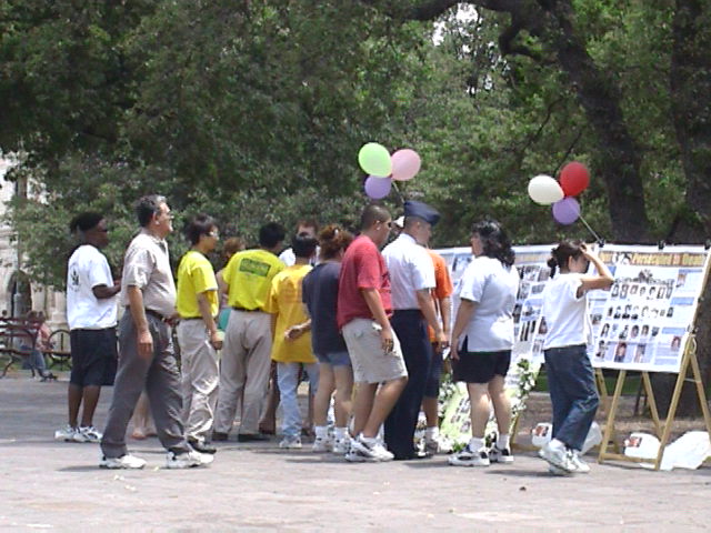 5月11日,市中心的阿拉莫广场焕然一新。南边亭子四周挂满“法轮大法”、“真、善、忍”、“世界法轮大法日”的横幅标语,在阳光下熠熠生辉。广场中央摆放着法轮大法洪传和揭露江罗政治流氓集团迫害大法的展板。展板上面漂浮着各种颜色的气球,充满了节日的气氛。