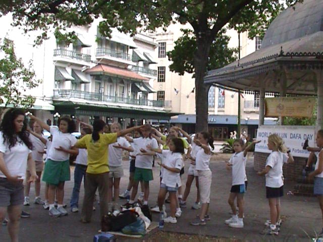 忽然从亭子周围传来一阵银铃般的笑声,继而又鸦雀无声。原来是一群小学生到这里来游玩,看到大法弟子在炼功,也认真地学起来。一张张稚嫩的小脸上写着幸闻大法的喜悦。
