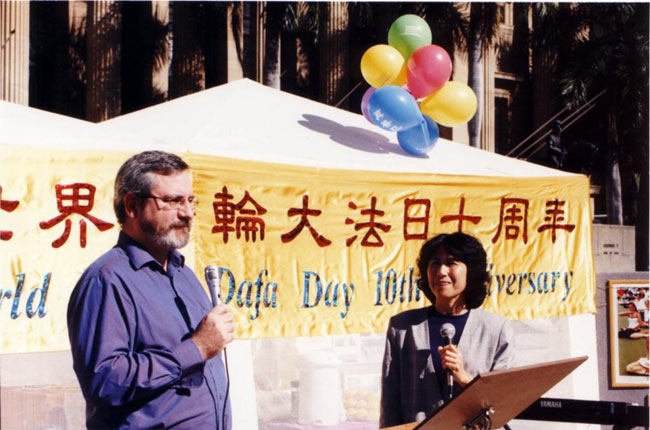 澳大利亚昆士兰州全体法轮功学员也以自己的方式开展庆祝,举行了一系列的活动。5月12日星期天,学员们聚集在市政厅广场举办了一整天的庆典。一贯以来支持法轮功的澳大利亚昆士兰州民主党参议员(ANDREW BARTLETT)安德鲁·巴特勒先生莅临并发表了热情洋溢的演说。他说,“真诚、善良、忍耐是我们党的宗旨之一,所以我完全理解,支持和提倡法轮大法真善忍的原则。今天的世界还存在许多不公正,还存在许多弊端,这表明我们应更加努力坚守‘真善忍’。我非常遗憾的看到法轮功及“真善忍”的理念正在中国遭到镇压。我希望社会中有更多的团体和个人能够奉行“真善忍”。”
