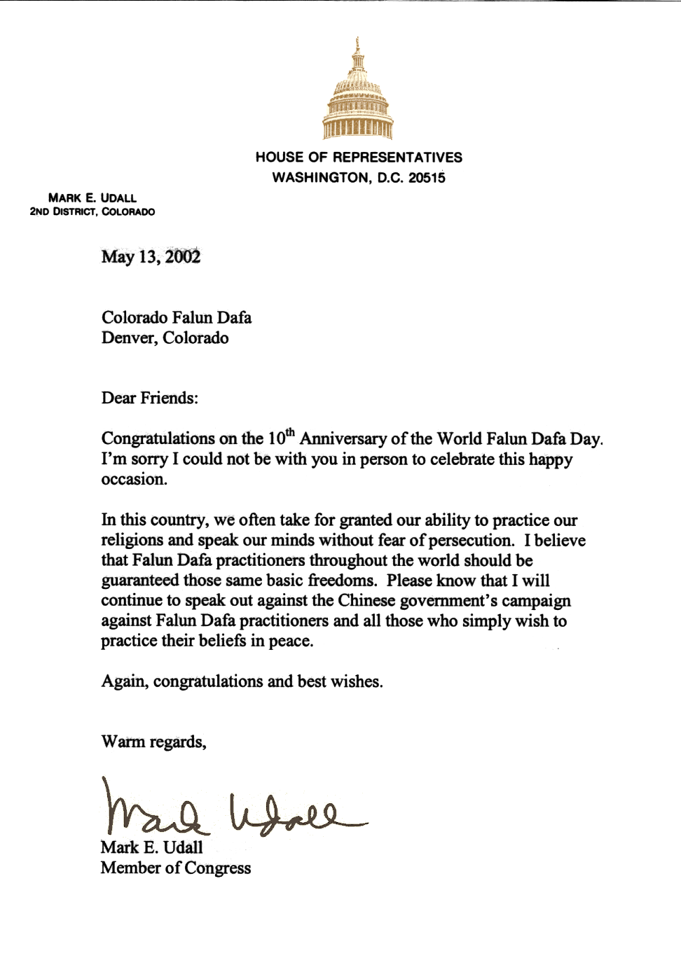 【明慧网2002年5月15日】科罗拉多州第2选区众议员马克 E.尤德尔(Mark E. Udall)的祝贺信。