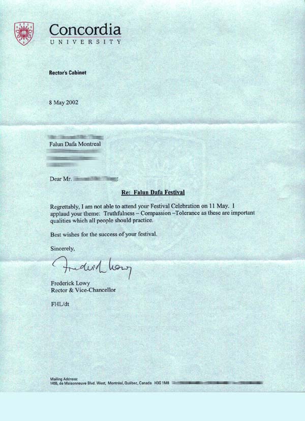 【明慧网2002年5月15日】加拿大康考迪亚大学(Concordia University)校长兼校副董事长福莱德里克.劳维(Frederick Lowy)的祝贺信。