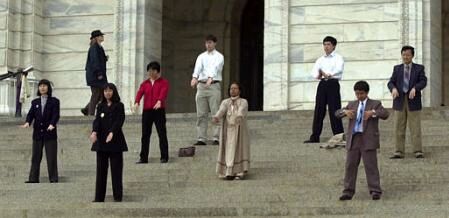 图片一:2002年5月13日星期一,人们在明尼苏达州圣保罗市州议会大厦的台阶上炼法轮功。这次炼功活动是为纪念法轮功在中国创立十周年而举行。(美联社图片/Eric Miller)