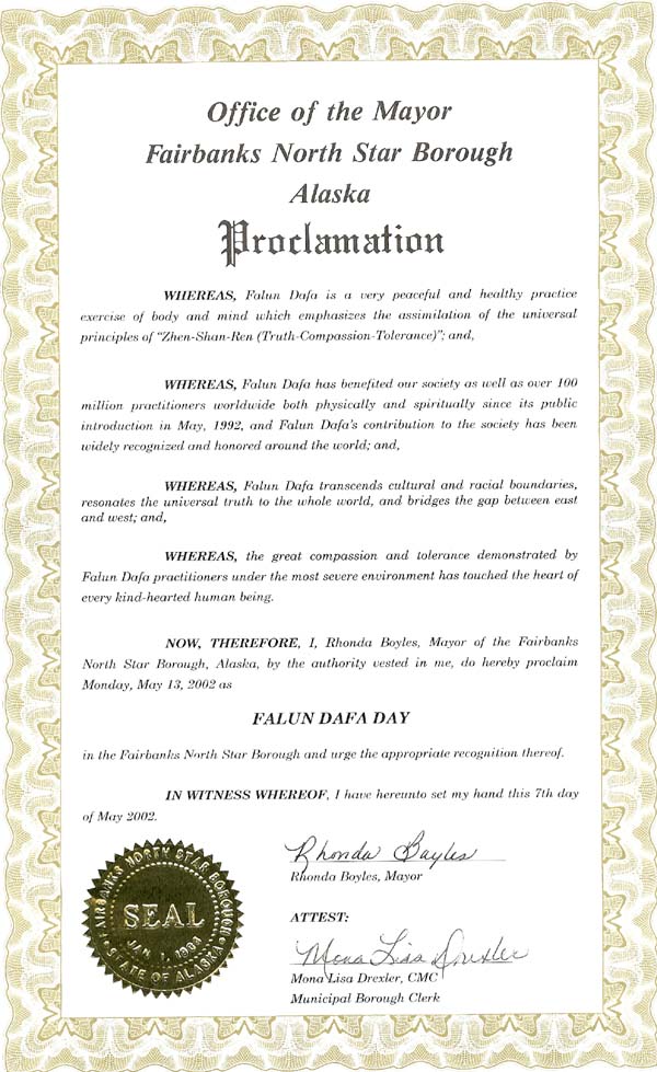 在此,我,阿拉斯加州费尔班克斯北极星市(Fairbanks North Star Borough)市长朗达. 博伊尔斯,运用赋予我的权力,特此宣布2002年5月13日星期一为费尔班克斯市的