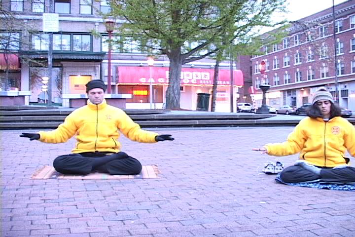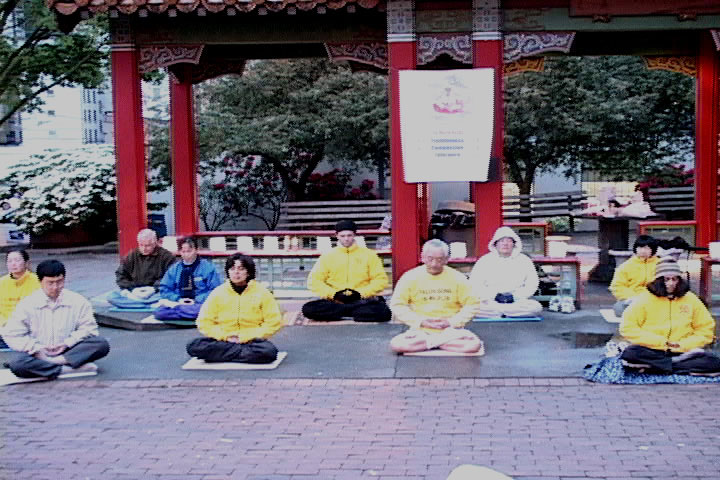 为了纪念这些同修,西雅图地区的部分大法弟子在华埠的庆喜公园,浩然亭周围举行了24小时的静坐和烛光守夜。在这“大法洪传十周年”的日子里,苍天也为之感动。傍晚时分,华埠周围乌云翻腾,云里压城,大雨倾盆。唯有大法弟子们打坐的露天,既无风,也无雨。天清体透。