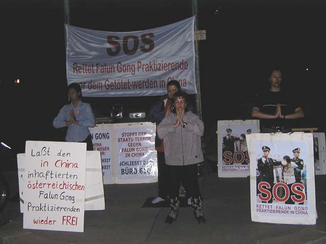 【明慧网2002年5月16日】获悉奥地利法轮功学员亚历山大.哈姆尔(Alexander Hamrle)在中国长春被捕,现下落不明,部分奥地利大法弟子来到中国驻奥使馆,举行烛光守夜,呼吁立即释放亚历山大。