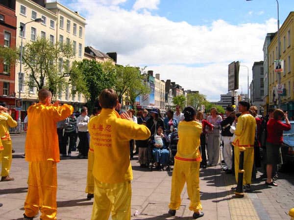 结束了游行之后,在市中心大邮局对面的奥康纳(O’Connell St.)大街上,大法弟子们开始了炼功洪法。
