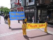 5月11日,爱尔兰大法弟子驱车200多英里来到爱尔兰第二大城市考克(Cork)。我们早晨8:00左右从首都都柏林(Dublin)出发,不顾近五个多小时的车马劳顿,到达Cork后,立即在市中心开始了炼功洪法。当日的Cork艳阳高照,和风宜人。结束了炼功洪法后,大法弟子们在充满悲悯的“普度、济世”音乐声中,举着自己制作的“五月十三日法轮大法日”、“法轮大法真善忍”、“世界需要真善忍”、“赵明归来,感谢爱尔兰”等横幅,行进在这个爱尔兰南部城市的街道上。Cork是爱尔兰第二大城市,这里的人民善良友好。去年,爱尔兰大法弟子第一次“SOS步行”的终点就是这里。这儿的许多媒体也曾对我们的许多活动和中国江泽民政府迫害法轮功的暴行作过报道。