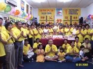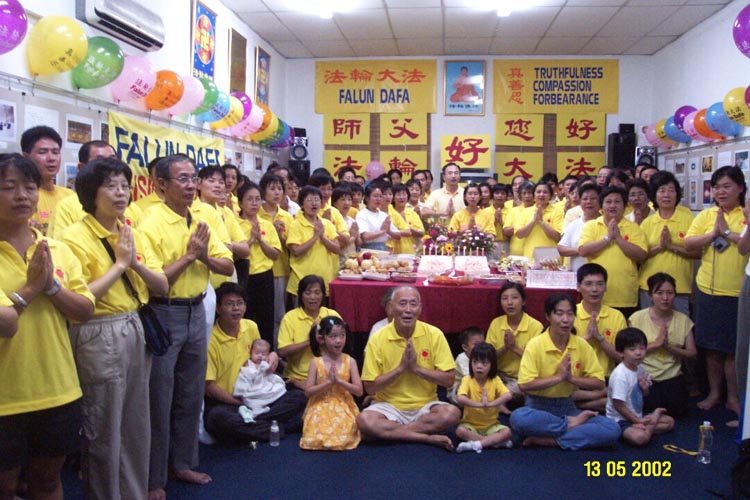 晚上,全体学员从各路汇集一堂,举行隆重的祝贺活动。小小的活动室充满了节日气氛:四面墙上挂着师父的照片和正法之路的图片,图片上插放了五颜六色的大法气球。正对入口处挂着新制作的大块展板,黄底红字写着:“法轮大法好,师父好!”学员们表演了诗朗诵‘天上人间的辉煌圣日’,和长笛独奏‘随师正法’。然后,播放了放光明电视制作中心的有关法轮大法日的庆贺节目。看着屏幕上世界各地大法弟子的集体炼功及庆祝场面,听到一批又一批的大法弟子向慈悲伟大的师尊的问候,大法弟子们的眼睛湿润了。