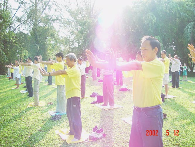 五月十二日傍晚,全体学员在风景优美的东海岸公园进行了大型集体炼功活动。学员们身穿印有的‘法轮大法弘传十周年’的T恤衫,在和煦的阳光下炼习着优美的功法,吸引着过往的游客驻足观看。
